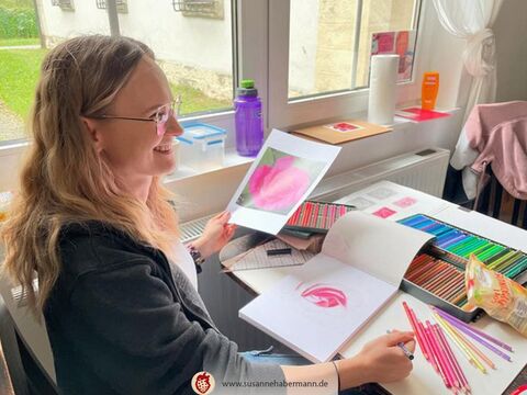 halb fertige Zeichnung einer rosa Blüte, eine Hand hält einen Buntstift - Zeichenkurs  - Zeichenunterricht - Großraum Nürnberg - Landkreis Neustadt a.d.Aisch-Bad Windsheim -   "Fotorealistisch Zeichnen mit Buntstiften" bei Susanne Habermann - Zeichnen im