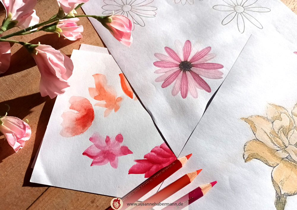 Buntstiften oder Bleistiften, evtl. mit Aquarell. Blumen nach der Natur zu zeichnen, wird ein weiteres Thema sein.